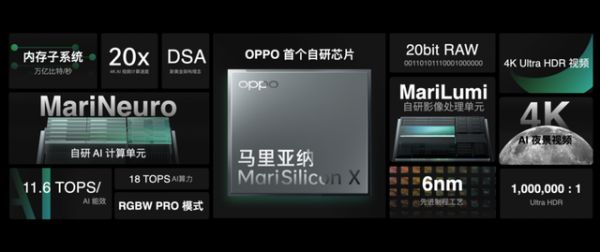 另外,这款芯片还集成了自研的MariLumi 影像处理单元,支持20bit Ultra HDR相较于传统HDR提升了4倍,可以实现无损影像链路的实时RAW计算以及最大化传感器能力的RGBW Pro,全面提升手机的影像表现。加上OPPO自研AI降噪算法,马里亚纳MariSilicon X能够以4K的规格,实现40FPS的处理速度,相较于传统NPU的2FPS速度提升了20倍之多。