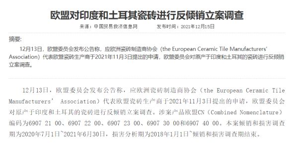 12月13日,欧盟委员会发布公告称,应欧洲瓷砖制造商协会(the European Ceramic Tile Manufacturers’ Association)代表欧盟瓷砖生产商于2021年11月3日提出的申请,欧盟委员会对原产于印度和土耳其的瓷砖(Ceramic Tiles)进行反倾销立案调查。涉案产品欧盟CN(Combined Nomenclature)编码为6907 21 00、6907 22 00、6907 23 00、6907 30 00和6907 40 00。