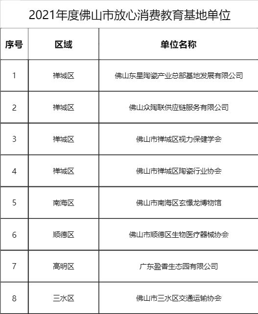 12月13日,佛山市放心消费创建工作领导小组办公室公示了拟确定的2021年度佛山市放心消费单位(点)。其中,佛山东星陶瓷产业总部基地发展有限公司、佛山众陶联供应链服务有限公司、佛山市禅城区陶瓷行业协会3家陶瓷行业单位被评为2021年度佛山市放心消费教育基地单位,广东方向陶瓷有限公司、恒洁卫浴集团有限公司等被评为放心消费维权服务站单位。