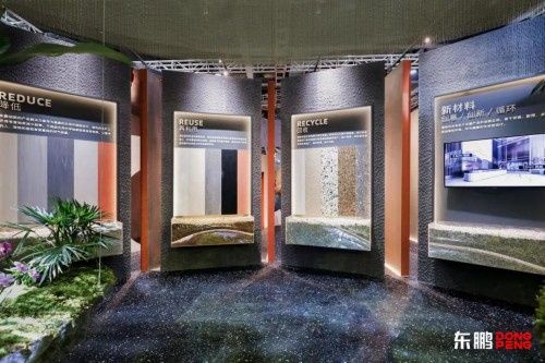 东鹏岩板通过应用意大利数码磨具及微米级喷釉技术,还原万物材质及立体肌理,是行业内一种革命性的材料新物种。通过取缔传统的木材、石材等天然材料,能有效减少对自然资源的开采,响应全球生物多样性的倡议。而同样在广州设计周上亮相的东鹏生态石,是东鹏控股自主研发、集绿色环保与装饰美学于一体的新型无机装饰材料。通过特定的纹理技术、物理高频振动与真空高压成型,无需烧结,利用零废弃技术,是一种新型创新的绿色环保建材。