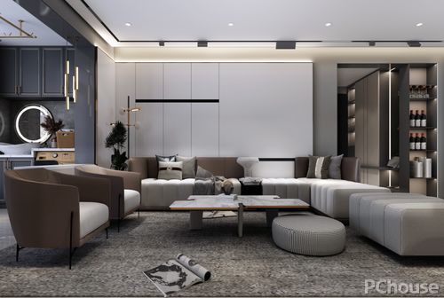 客厅大量线性光线的使用,让整个空间更加简洁、线条清晰。整个客厅色调在咖色中徘徊,浅咖、深咖、暖灰,相似色不同材质展现出一个优雅、安静且温暖的生活空间。