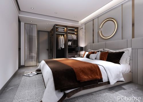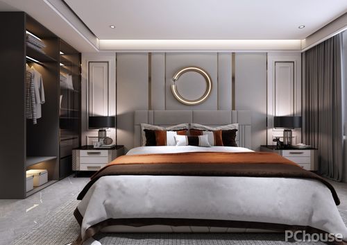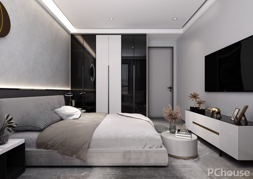 卧室以深浅色为主色调,软包床头加地毯点缀散发着安宁恬静的舒适感和温暖基调。一柜到顶的橱柜设计,既能装又不让顶部落灰。