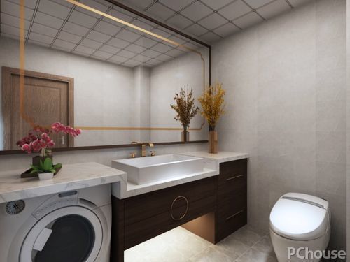 而对于卫生间的设计,则用灰色瓷砖和白色洗手台给底色定调,空间上讲究层次感,体现出了中式风格的素简之意,沉稳内敛。