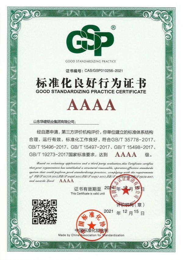 12月15日,华建铝业集团经中国标准化协会认证机构严格评审,成功通过“AAAA级标准化良好行为企业”认证。