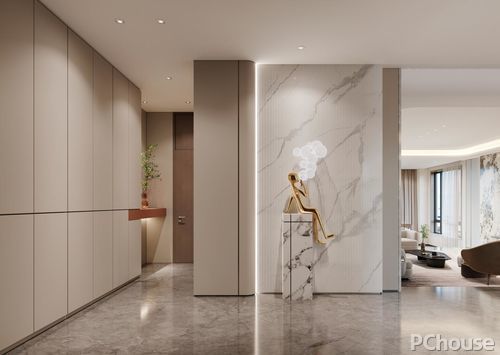 玄关设计非常巧妙,进门映入眼帘的是非常具有特色的艺术摆件,一边打上灯光营造温馨氛围,在白色石材背景墙的衬托之下,精英感扑面而来。