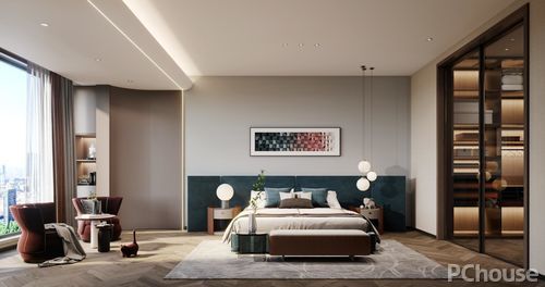静谧恬淡的卧室,是精神与肉体的集中归宿,所思所梦,都游离在这卧室里。蓝色主色调的卧室可以安抚身心的疲惫,蓝色的墙面搭配卡其色、红色的家具,优雅而清新。