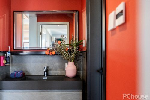 明亮的红棕色,辅以黑色的台面与粉红色的装饰物,在活力中带上沉稳与一丝小俏皮,强烈的视觉对比,让整个空间充满层次感。