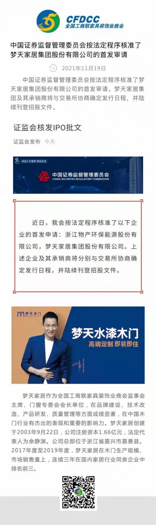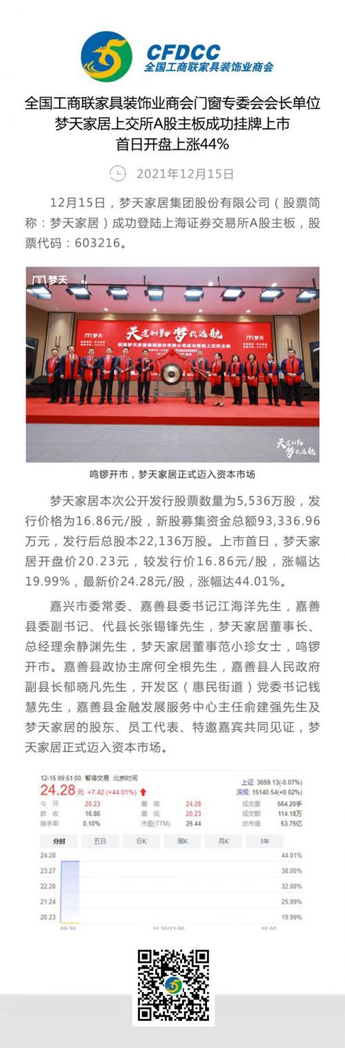 12月15日,全国工商联家具装饰业商会门窗专委会会长单位梦天家居集团股份有限公司(股票简称:梦天家居)成功登陆上海证券交易所A股主板,股票代码:603216。