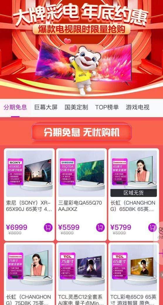 与去年相同,今年似乎还是倡导“居家过年”,那么电视+春晚或许是更具年味儿的组合了。不过,考虑到移动终端已是大众化的设备,想必很多人都未曾置办客厅大屏。为此,“真快乐”APP推出了“大牌彩电年底约惠 爆品限量抢”促销活动,这里不仅有索尼、三星、长虹、TCL等大牌,还有“分期免息 无忧购机”、“巨幕大屏 客厅优选”活动专区。不知道如何选择的朋友,也可以参考“TOP榜单 轻松选购”、“更多电视推荐”,相信每个人都能购买到适合自己的电视产品。https://gome.cn/EexRR