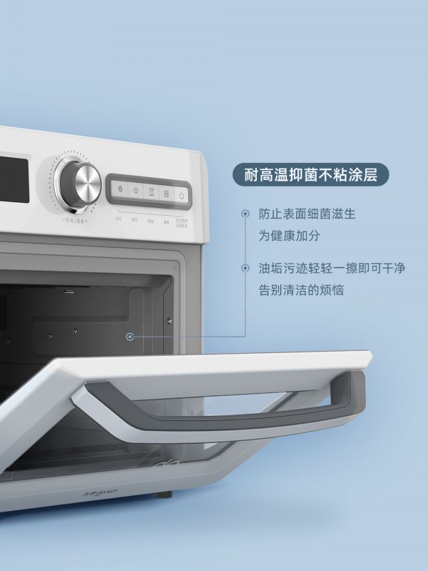东菱空气炸烤箱对下厨减负的执着毫不含糊。内腔喷涂抑菌高温油,无惧冷热骤变,稳定性强保障使用安全。采用的不粘材质不易粘附油污,一擦即净,污渍轻松攻破,清理十分省力。内腔添加的天然抑菌剂,更能有效防止细菌滋生,给用户带来双倍安心。