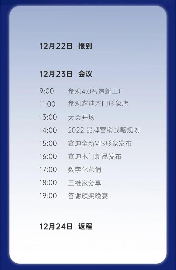 距离上次年会已经过去一年半,久别重逢的我们,期待与经销商家人的相见,让我一同直面挑战,共谋发展。值此,经公司领导决定:2021年12月23日在公司总部举行“2022鑫赋能 无限能——鑫迪木门经销商精英年会暨2021年度颁奖盛典”,并借此助力全国家人们优化终端,抢占客户,共创明年辉煌业绩。