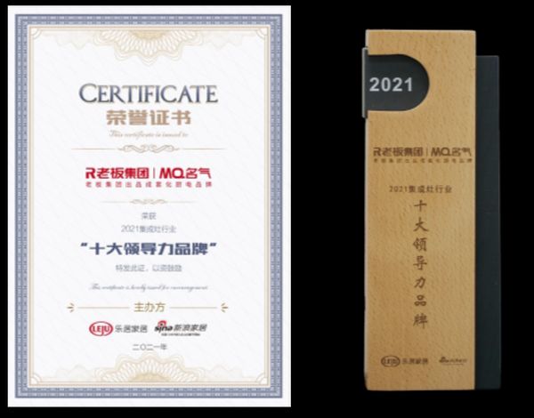 荣耀见证!老板集团MQ名气荣膺新浪家居“2021集成灶行业十大领导力品牌”