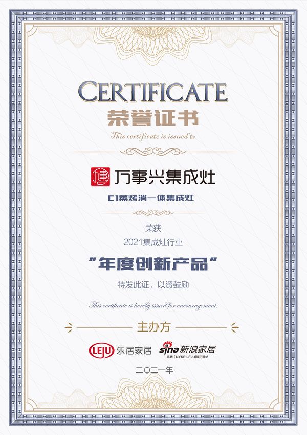 在会议中的年度荣誉榜单揭晓环节中,浙江万事兴电器有限公司(以下简称“万事兴”)喜获“2021集成灶行业十大影响力品牌”,并率其万事兴C1蒸烤消一体集成灶荣获“2021年度创新产品”。