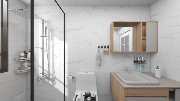 淋浴区的转角处也要充分利用起来,无论是墙上空间,还是地上位置,都可以安装搁板或者摆放收纳架,填补角落的空白,达到收纳目的。