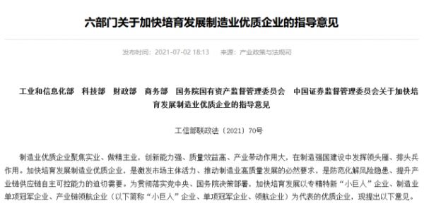 为此,工信部、科技部、财政部、商务部、国资委、证监会六部门联合发布了《关于加快培育发展制造业优质企业的指导意见》,明确提出将构建优质企业梯度培育格局,力争到2025年,梯度培育格局基本成型,发展形成万家“小巨人”企业、千家单项冠军企业和一大批领航企业,目的就是为了引导制造企业专注创新和产品质量提升,在更多细分产品领域形成全球市场、技术等方面领先的单项冠军地位,提升我国制造业国际竞争力,促进我国产业整体迈向全球价值链中高端。