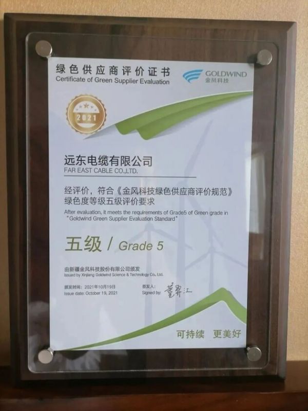产品安全可靠性高、环境适应性广、电气机械性能优异,为风力发电机组提供了强有力的保障,赢得海内外风电主机商的一致赞誉。远东电缆两次荣获金风科技颁发的供应商最高等级荣誉——“五级绿色供应商”称号,获得运达风电授权的“2020年最佳保供奖”等,同时成功参与到多个国内重点风电项目中。