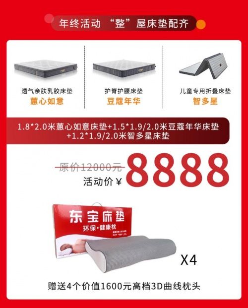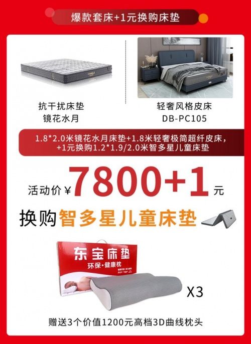 活动期间,在东宝床垫专卖店购买镜花水月床垫+轻奢极简超纤皮床活动套餐,立即赠送一张智多星儿童床垫和三个高档3D曲线枕头。