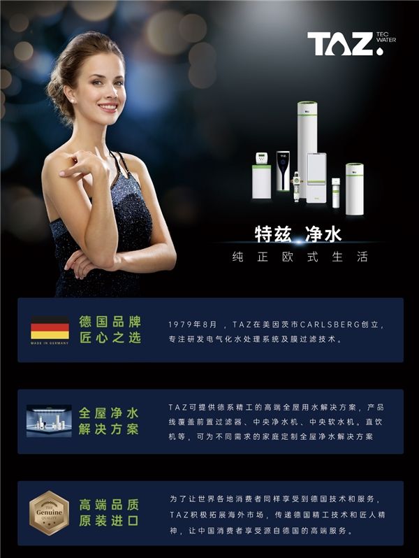 TAZ净水1979年诞生于德国西南部美因茨市的美丽小镇Carlsberg,一直走在德国家用净水技术的最前沿,依托公司雄厚且低调的科技背景,将独特的电气化水处理系统和成熟的膜过滤技术完美结合,成功打造了电气化全屋净水系统产品线,从工业净水领域进入并升级家用净水系统,同时整合创新的智能和物联网技术,为家庭净水带去福音。