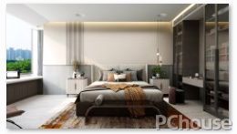 主卧宽敞有度,吊顶无主灯悬浮设计+石膏板背景割槽修饰,突出极简特点,营造出温馨宁静,为用户提供一个舒适的环境。