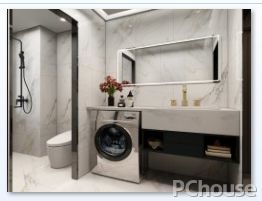 次卫生间地砖选用与厨房同样的花色瓷砖,保持视觉一致,浴室柜外移,起到干湿分离的效果,实用又方便。