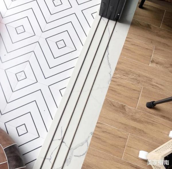 这种极简地轨,也是最近几年才流行的,它舍弃了传统的凹凸槽设计,而是将铜条直接嵌入瓷砖或者是粘贴在瓷砖上,样式要比传统地轨简洁许多。