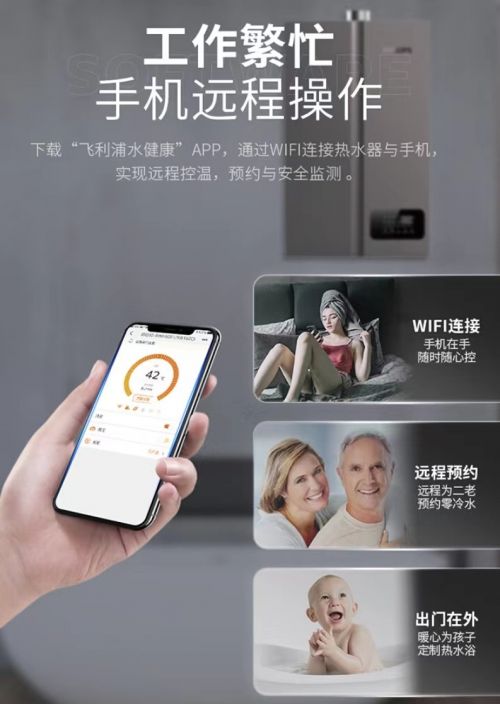 这款产品的零冷水技术在国际处于先进水平,全程无冷水。开启零冷水模式,热水器会预热循环管内冷水,不用再等待冷水放完,水龙头一开,热水即来。老人可以选择led触控屏操作,年轻人可以在APP上随时随地操作。“飞利浦水健康”APP,通过Wifi链接热水器与手机,实现远程控温,预约以及安全检测。另外,飞利浦燃气热水器提供多种循环模式——单次循环、定时循环、24小时循环,舒适与节能自由选择。