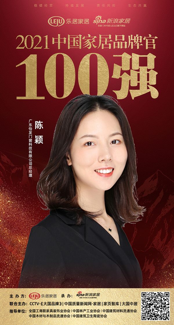 新浪家居 2021年12月18日,“智见•2021中国家居新时代盛典暨金致奖颁奖典礼”在广东佛山盛大启幕。由乐居家居主办、新浪家居承办,CCTV•大国品牌、中国质量新闻网•家居、家页智库、大国中居联合主办的「2021中国家居品牌官」评选在盛典隆重揭晓。怡发门窗总经理陈颖荣膺「2021中国家居品牌官100强」称号。
