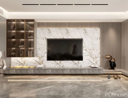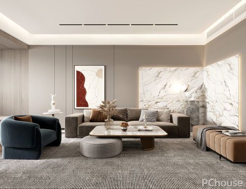 以大理石沙发背景墙,呈现的是一种奢华大气的质感,搭配木饰面的墙面,温暖柔和,轻轻松松就打破了大白墙的单调与乏味。凹槽内嵌灯带,增加空间的美感也是很有必要的。