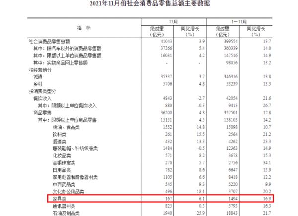 统计局:1-11月家具零售1494亿元,同比增长16.9%