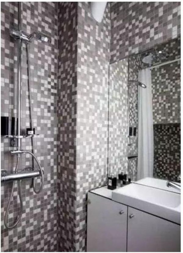 卫生间就在柜子旁边,马赛克瓷砖很有情调,空间虽小但实用。