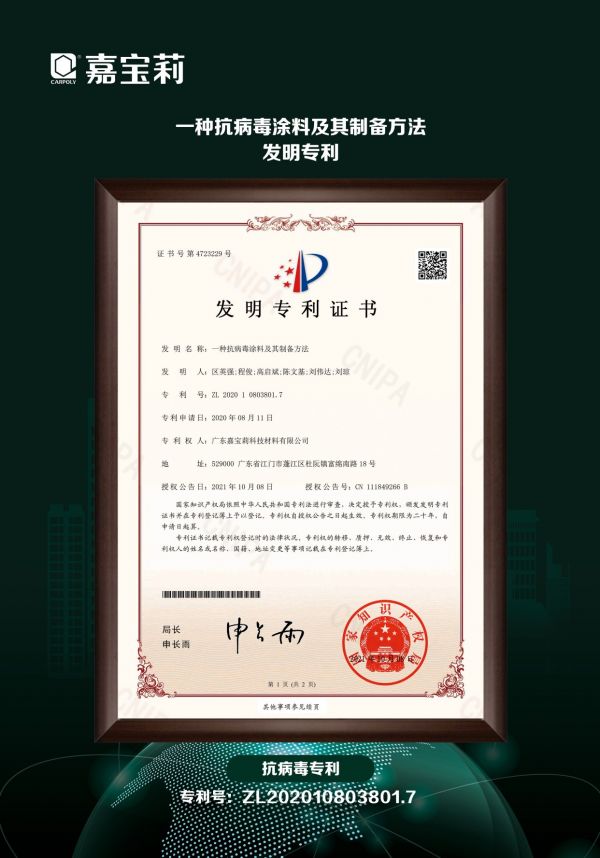 2020年,嘉宝莉携手康宁公司在推出了一款应用Corning Guardiant™技术的抗病毒涂料——BB氧吧抗病毒儿童墙面漆。在研发这款用于家居空间墙面的产品后,嘉宝莉发起申请并获得了《一种抗病毒涂料及其制备方法》的发明专利。该项发明专利技术有效地保证了涂料的长期稳定性以及抗微生物效用。嘉宝莉凭借其一直以来对研发的执着与专注,通过优越的科研实力和丰厚的技术基础,推动了抗病毒涂料行业的制备技术方向。