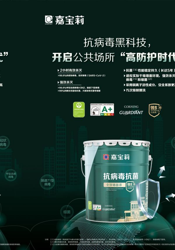 令人振奋的是,在抗病毒涂料细分领域持续发力的嘉宝莉,于近日再添黑科技新品——抗病毒抗菌全效墙面漆。据悉,新上市产品就是利用铜的抗微生物功效,其采用了Corning Guardiant™技术,是将铜最活跃的抗微生物价态进行封装并缓慢释放,同时配以自主研发的铜离子涂料配方稳定技术【4】,如此一来可保证涂料长期的稳定性以及抗微生物效用。