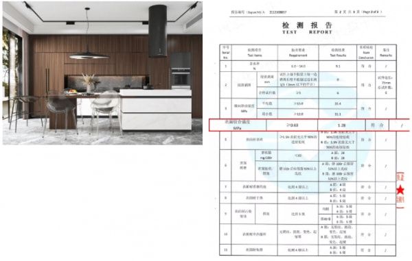 天然豆香板中的大豆蛋白胶,经权威机构样板检测结果显示,天然豆香生态板胶合强度高达1.28MPa,优于国家标准要求的≥0.6MPa2倍。除此以外,我们还对成品天然豆香板产品进行了水煮72小时测试实验,测试结果显示,经过72小时水煮后板材不开胶,耐水性极好,非常适合用在厨房和浴室等潮湿环境中。这样我们就能有效降低因厨房和浴室长期受潮而产生的脱胶现象。