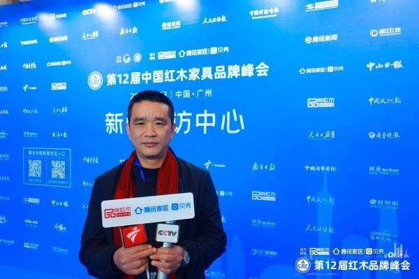 在第12届中国红木家具品牌峰会上,天勤红木董事长周国航接受中央电视台、腾讯家居等媒体的采访