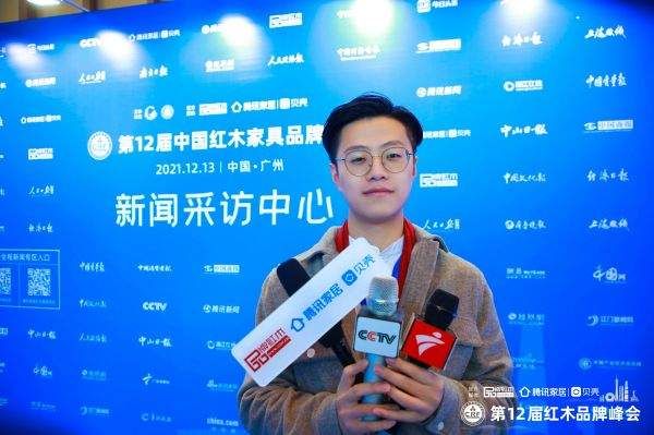 在第12届中国红木家具品牌峰会上,名匠艺林总经理张裕康接受中央电视台、腾讯家居等媒体的采访