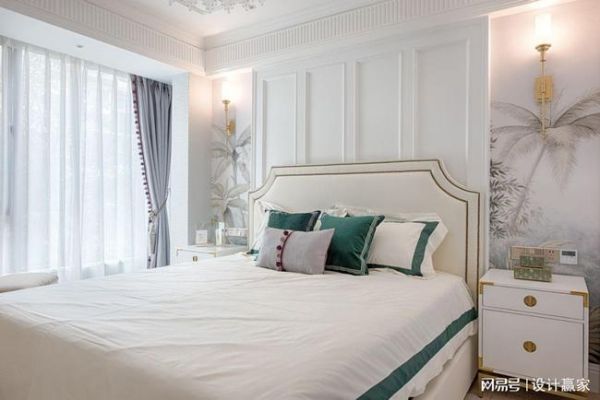 主卧以白色为主色调,墨绿、丁香紫、金色作为点缀,石膏线、植物墙绘,打破整体空间的沉闷感,冷中带暖,低调而舒适。