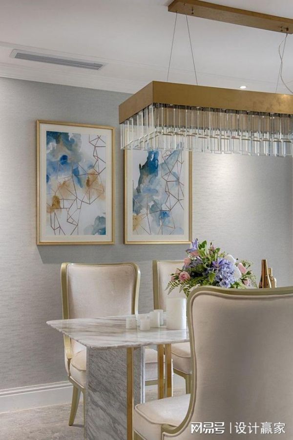 除了黄铜和大理石的相互映衬外,造型别致的桌子、时尚的吊灯、水彩装饰画等都极具现代摩登感,十分符合女主人都市女郎的气质。