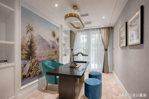 茶室除了轻奢标配元素黄铜、大理石、木材、玻璃等多元材质的混搭外,绿色和蓝色丝绒沙发的配置,让书香气质与灵动的气息相结合,充满了撩动人心的空间体验。墙面大幅的风景画野趣十足,清新自然。