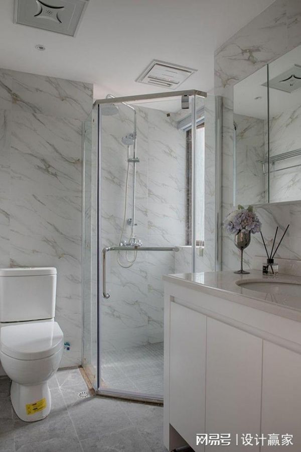 具有天然纹理的大理石瓷砖,搭配透明的玻璃浴室,干湿分离,干净整洁。紫色插花、白色瓷质洁具、木质储物柜让整体空间散发着别样的韵味。