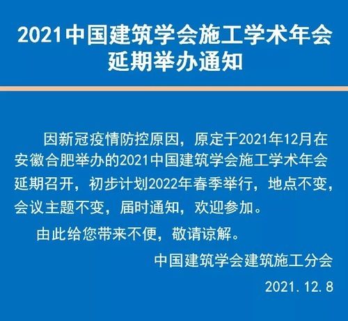 新浪家居设计频道讯 近日,中国建筑学会建筑施工分会发布公告称,由于新冠疫情防控原因,原定于2021年12月在安徽合肥举办的2021中国建筑学会施工学术年会延期召开,初步计划2022年春季举行,地点不变,会议主题不变。