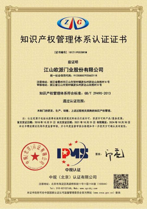 近日,江山欧派顺利通过知识产权管理体系再认证,再次获得国家级资质认定证书。《知识产权管理体系认证证书》是江山欧派在2018年首次通过认证后实现的“蝉联”认证,意味着公司在发展中对知识产权实现了有效的科学管理和运用,标志着公司知识产权管理体系方面再上新台阶。