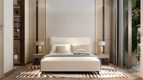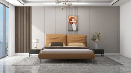 杏色铺陈的空间,优雅自然天成,软床的格纹设计是一大亮点,化单调为格调,杏色的温柔更多一份俏皮,是外界光向室内的一种延伸,如沐浴冬日暖阳,舒适而自在,营造出舒缓浪漫的睡眠氛围。