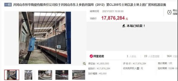陶卫快讯|江西一陶企成功拍卖1787.63万元成交