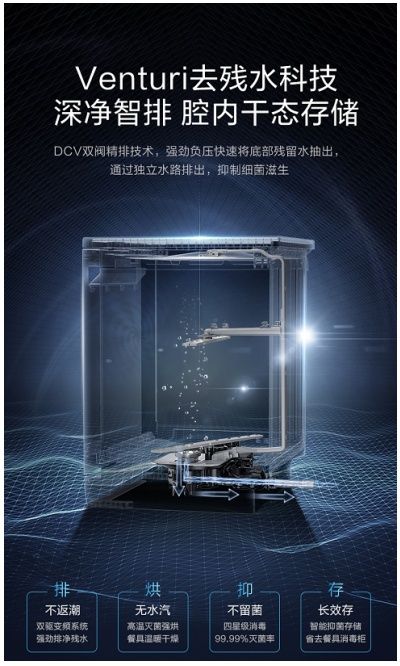 为了解决这一弊端,美的不断创新突出,研发出未来洗碗机F50,首款搭载Venturi去残水黑科技,通过DCV双阀智排技术,强劲负压快速将腔内底部的残留水抽出,通过独立水路排出,保持腔内干燥,从而抑制细菌滋生,让餐具存储更干净,为用户带来干态存储洁净抑菌新体验。