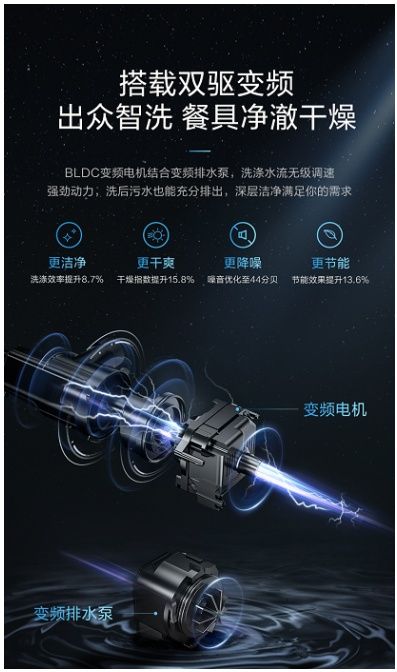 针对油腻碗碟以及排污难题,美的未来洗碗机F50,具备双驱变频技术,配合三层喷淋臂,不仅可以做到720°全方位强劲冲刷碗碟,深层去除碗碟油腻污渍,同时BLDC变频电机结合变频排水泵,为洗涤水流提供无级变速强劲动力,清洗过后,污水也能充分排出,做到轻松深层洁净碗碟,让餐具洁净如新。