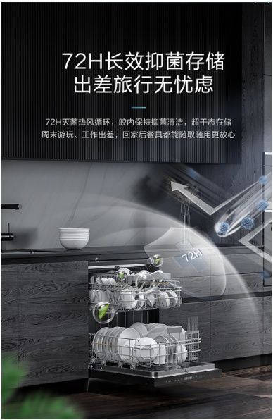 美的未来洗碗机F50,在带来强劲洁净碗碟的同时,还带来高温煮洗功能,通过高温加热,不仅能快速溶解碗碟表面油污,而且具备四星级消毒,针对金色黄色葡萄球菌、大肠杆菌等看不见的细菌,杀菌率高达99.99%,做到深入清洁,更有效的呵护宝宝的奶瓶、辅食餐具等。为了保障餐具的长效存储,它还搭载了72H灭菌热风循环功能,让腔内长效保持抑菌清洁,超干态存储,让用户即便是周末游玩、工作出差,回家后餐具都能随取随用更放心。