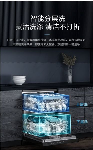 美的未来洗碗机F50精心设计智能分层洗功能,如果只有单人的餐具,就开启上层清洗,摆放也十分方便;2-5人的餐具可以开启下层清洗,高效便捷;当家庭聚会,全层清洗,16套餐具大容量,锅碗瓢盆一次搞定,完全中国大家庭洗涤需求,更加节能、干净、省心。
