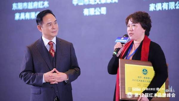 檀一新中式创始人丛东云(左三)上台接受“2021红木家具十大新中式品牌”颁牌