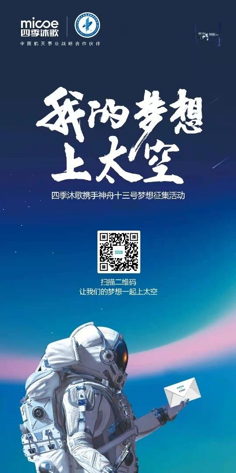 四季沐歌根植航天文化,在传播航天精神,科普航天知识的道路上做出了巨大贡献。日前,四季沐歌再度扬帆起航,携手中国邮政太空邮局发起“我的梦想上太空”梦想征集活动,这是四季沐歌继2011年举办的“携手神八 交会梦想”征集活动后,又一次大型梦想征集活动。活动将通过线上征集平台进行梦想征集,参与征集者的梦想将通过“天地通信”技术传输至太空,登上天宫空间站。四季沐歌希望能本次活动,能让更多人的梦想在太空中生根发芽,激发人们的航天热情,进一步为中国航天事业的蓬勃发展贡献力量。