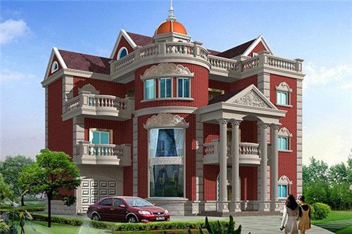 图片描述:这款房屋的占地面积大约在96㎡左右,房屋外墙以红色的墙砖为主,再配上大气的罗马柱和圆形屋顶设计,则可以将欧式气息展现到极致。而多窗的设计,则可以增加室内的采光和通风人,让业主居住起来更加的舒适。阳台和大露台设计,既可以供业主晾晒衣服,又可以供业主乘凉观景。